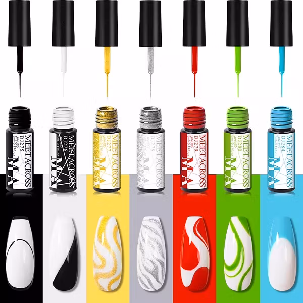 Små flaskor med gellack som man ska använda för olika dekorationer av nageln. Lacket har en smalare pensel än vanliga lack som är mer anpassad för dekoration.